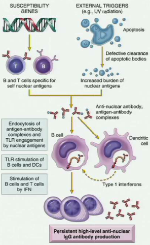 Susceptibility genes impair self tolerance and produce B and T cells specific for self nuclear antigens -> external environmental agent triggers increased burden of nuclear antigens -> ANA-antigen complex endocytosis, nuclear antigen engages TLRs -> Stimulation of B-cells and dendritic cells -> Release of type 1 IFNs -> Stimulation of B cells and T cells -> Persistent high levels of ANA IgG