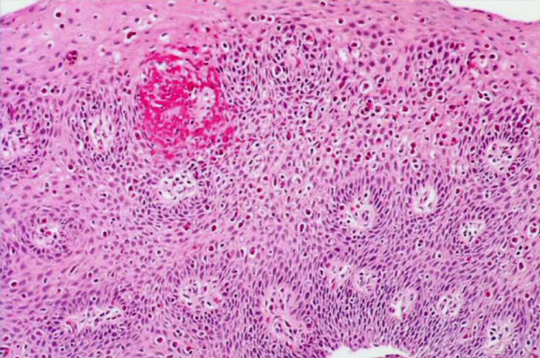 Squamous cell carcinoma is typically caught late and can spread out easily because the esophagus has no serosal layer.