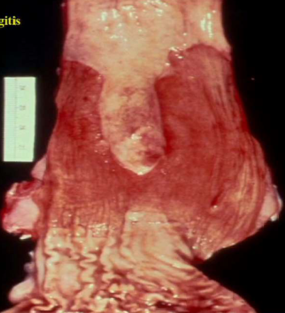Before this patient died, the pathologist received a biopsy from his esophagus. What three things are necessary to diagnose this patient with reflux esophagitis?