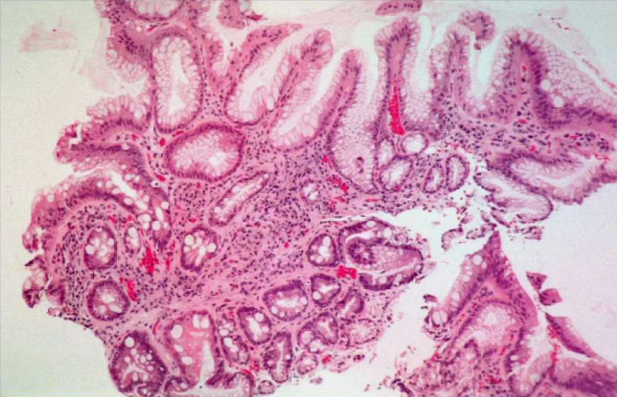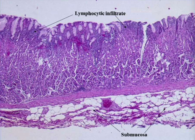 Note the lymphocyte infiltrate indicating chronic gastritis. The most common cause of this is H. pylori.