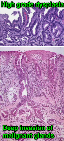 High grade dysplasia (top) and adenocarcinoma (bottom). Barrett esophagus is a premalignant lesion.