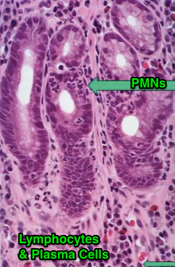 Acute: neutrophils. Chronic: plasma cells & lymphocytes. The picture below is chronic active gastritis due to presence of neutrophils in the glands in the setting of lymphocytes and plasma cells.