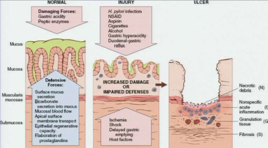 H. pylori, NSAIDs, Aspirin, cigarrettes, alcohol, hyperacidity and duodenal-gastric reflux can all diminish the mucus layer and cause epithelial damage.