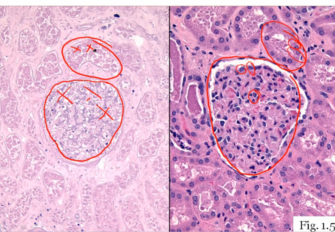 On the left you see tissue that has preserved cell shape and structure (maintained architecture) but no nuclei