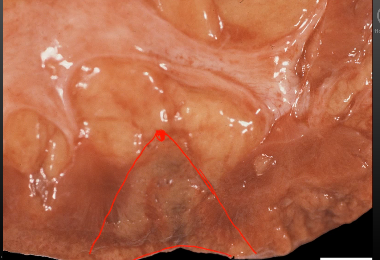 Coagulative necrosis 2/2 ischemic infarct- see wedge-shaped pale area of infarction