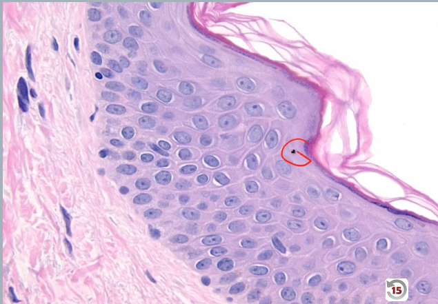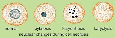 Starts w/ pyknosis (nuclear shrinkage), then karyorrhexis (nucleus breaks up), then karyolysis (little pieces are broken down into building blocks) and then nucleus gone!