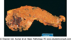 Image showing both liquefactive (black stuff) and fat necrosis (chalky white)