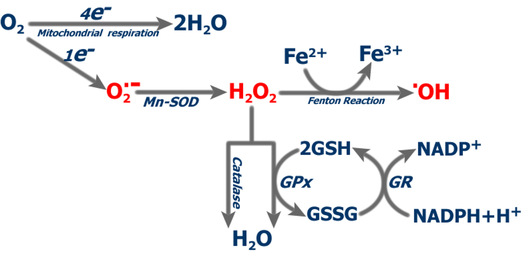 (a) O2 –> O2- (superoxide) –> H2O2 (hydrogen peroxide) –> OH- (hydroxyl free radical) –> H20