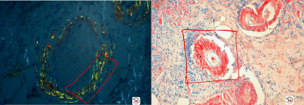 Name the two histological features used to diagnose amyloidosis on fat pad biopsy
