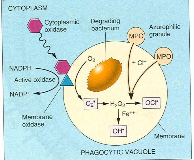 (b) Then O2- –> H2O2 (by supraoxide dismutase), H2O2 –> HOCl- by MPO (myeloperoxidase)