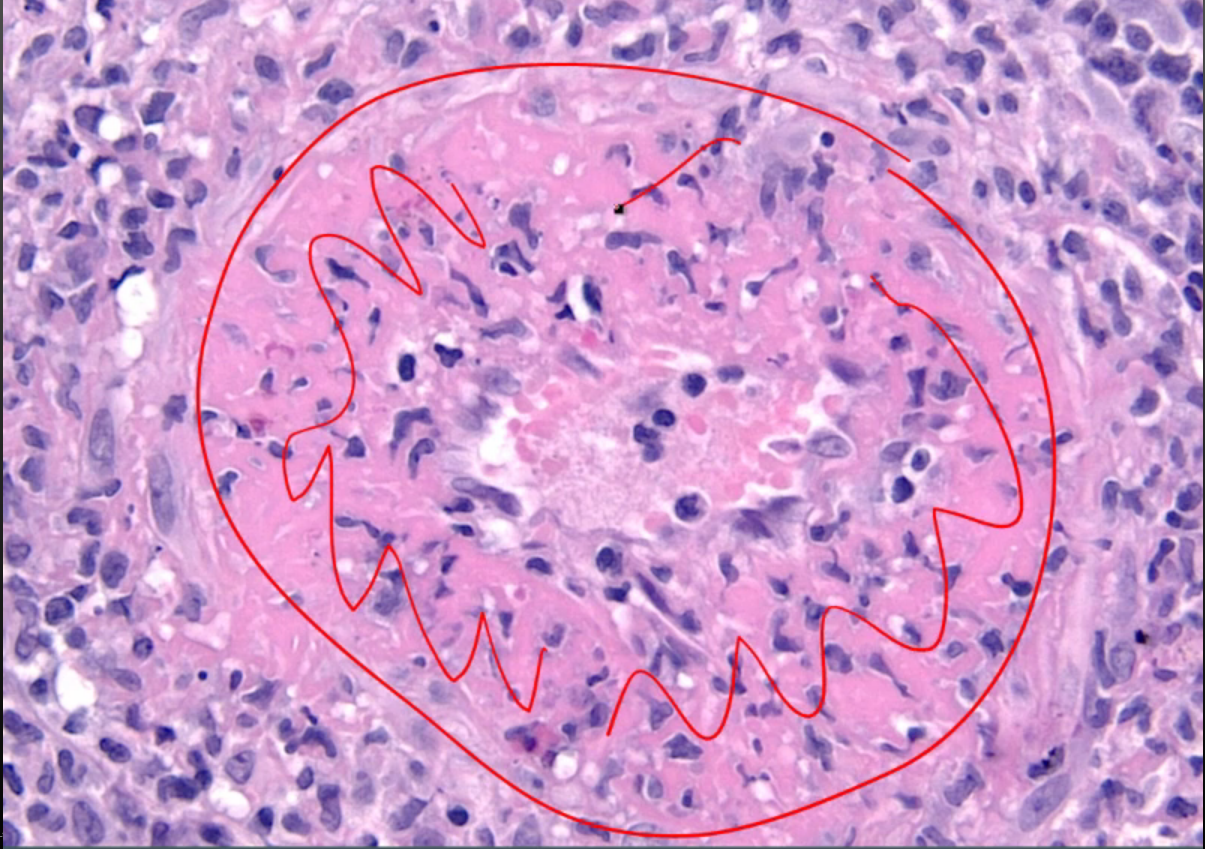 Histologically characterized by fibrinoid necrosis (see the ton of pink squiggled in the pic)
