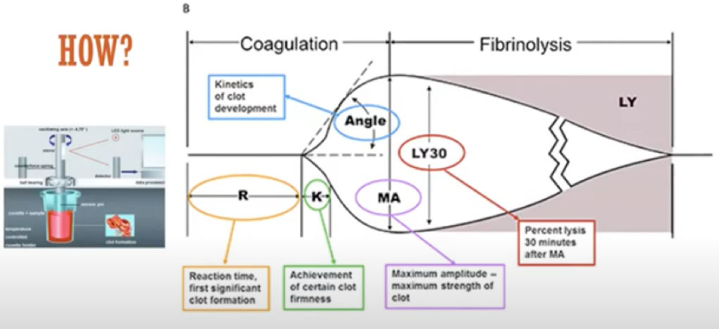 A (alpha angle) = kinetics of clot development (rate at which fibrin cross-linking occurs)