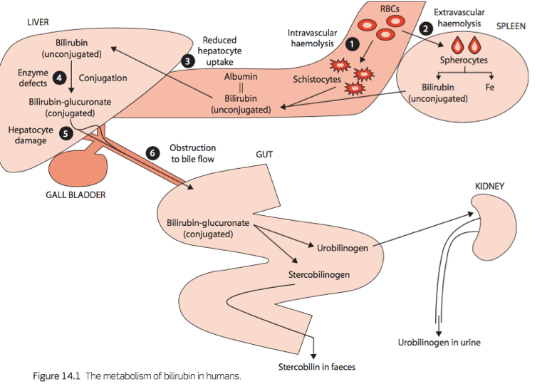 RBCs are broken down by macrophages in the spleen; haemoglobin-> iron and unconjugated bilirubin (travels to liver bound to albumin).