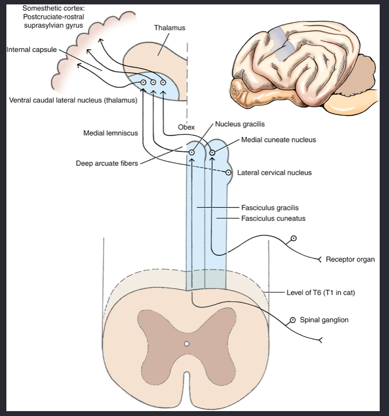 GP axons -> dorsal grey column -> ispilateral lateral funiculus caudal to cervical intumescence -> nucleus Z of caudal medulla (synapse) -> decussation -> ventral lateral caudal nucleus of thalamus (synapse) –> internal capsule -> somesthetic cortex (parietal lobe, caudal to the cruciate sulcus) (contralateral to the start of the GP axons)