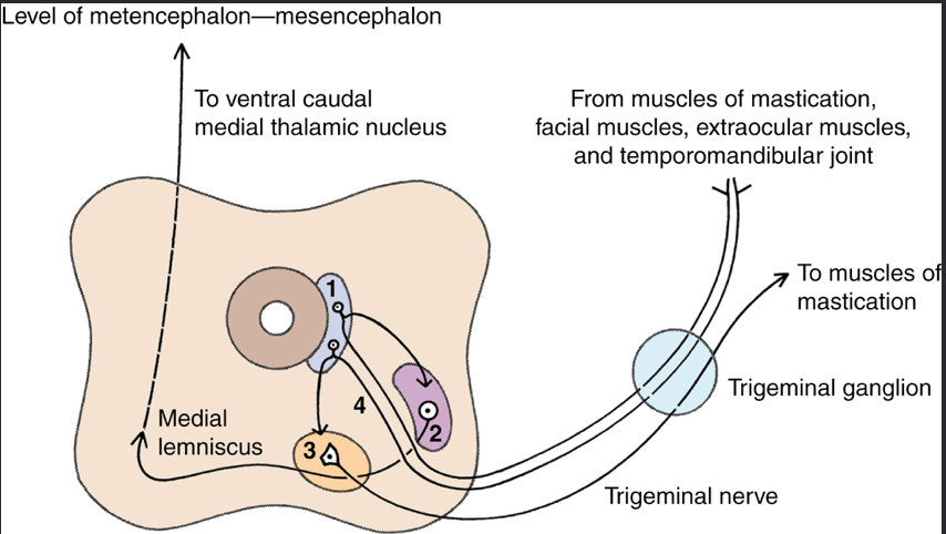 GP receptors in muscles of mastication, facial and extraocular muscles and TMJ -> thru 3 branches of CN V -> trigeminal ganglion (pars petrosa ossis temporalis) without synapse -> mesencephalic nucleus of the CN V (synapse)