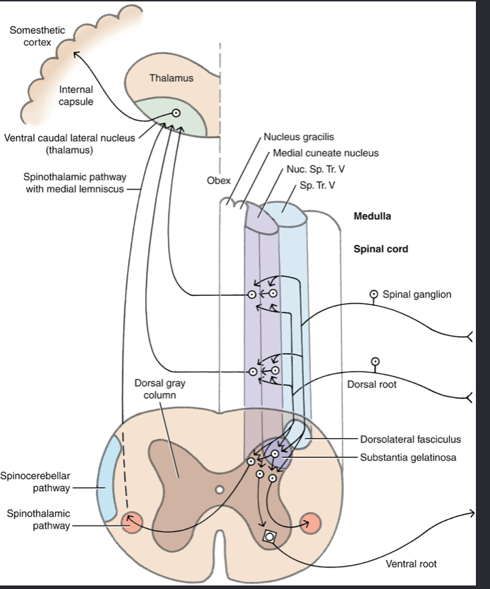 Spinocervicothalamic (pain /only somatic/ and touch) - ipsilateral
