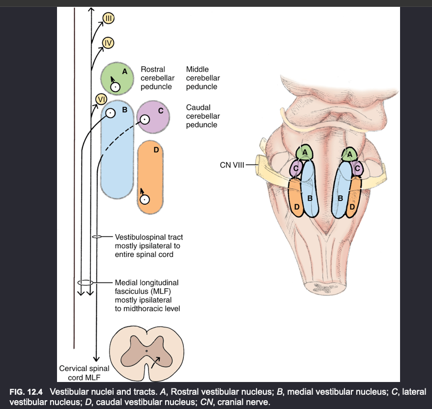 cranial nerve IV—extorsion; cranial nerve VI—medial; cranial nerve VIII (vestibular)—ventrolateral, inconstant