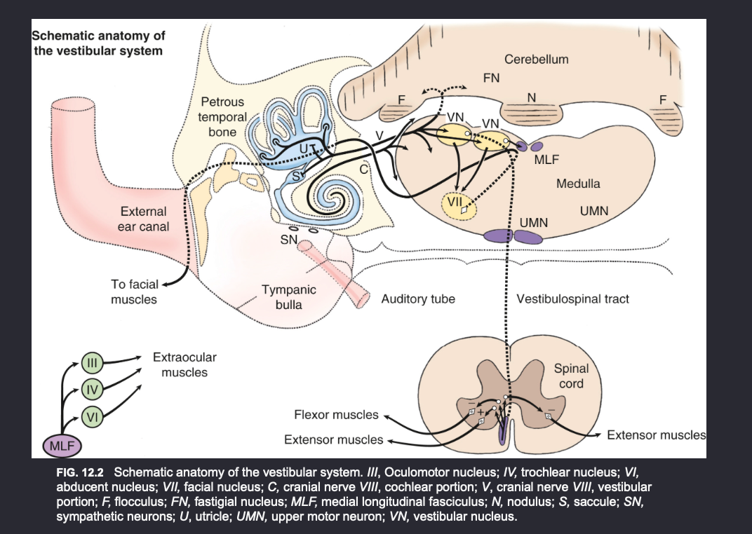 Normal physiologic (vestibulo-ocular) nystagmus: cranial nerve VIII (vestibular)—brainstem—MLF; cranial nerve VI for abduction and cranial nerve III (GSE) for adduction