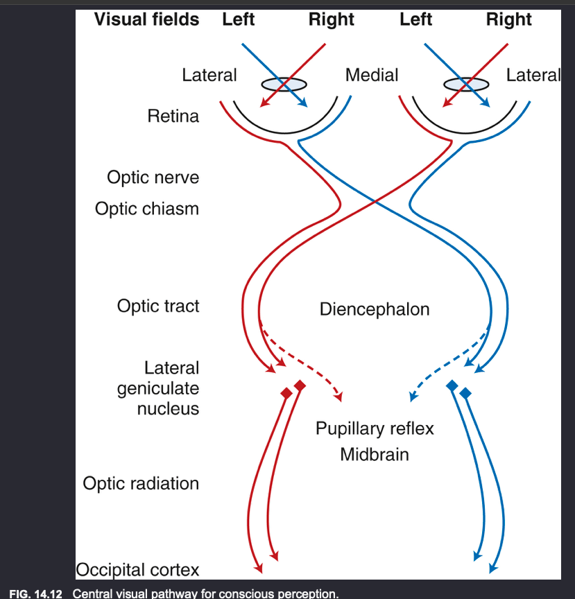 Fotoreceptor cells (rods/cones) > bipolar neurons > ganglion neurons > optic nerve (axons of ganglion neurons) > optic chiasm (decussation, the axons of the medial/nasal ganglion neurons cross) > optic tracts > lateral geniculate nucleus (about 80% of axons synapse) > internal capsule > optic radiation > visual cortex (occipital lobe)