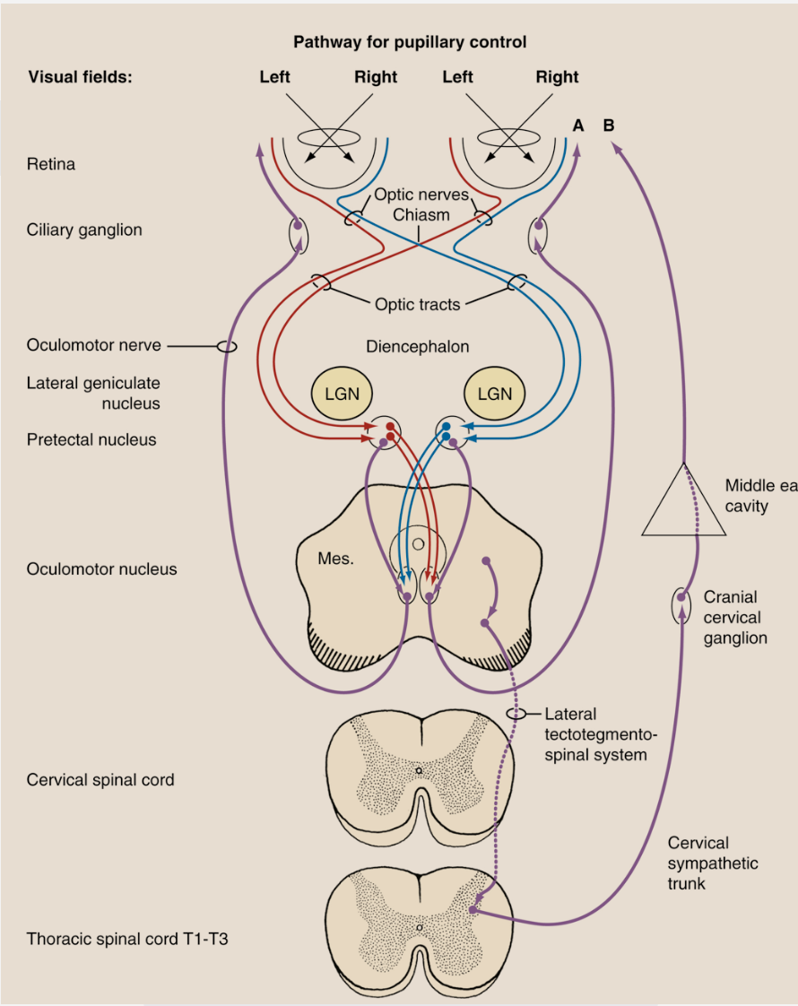 Fotoreceptor cells (rods/cones) > bipolar neurons > ganglion neurons > optic nerve (axons of ganglion neurons) > optic chiasm (decussation, the axons of the medial/nasal ganglion neurons cross) > optic tracts > lateral geniculate nucleus (the 20% of axons that didnt synapse here for concious vision perception pass over the nucleus) > mesencephalic pretecal nucleus > caudal commisure > contralateral GVE parasympathetic motor nucleus of CN III > oculomotor nerve -> orbital fissure -> ciliary ganglion (synapse with ganglionic neuron cell bodies) -> short ciliary nerves -> ciliary muscle and sphincter of the pupil