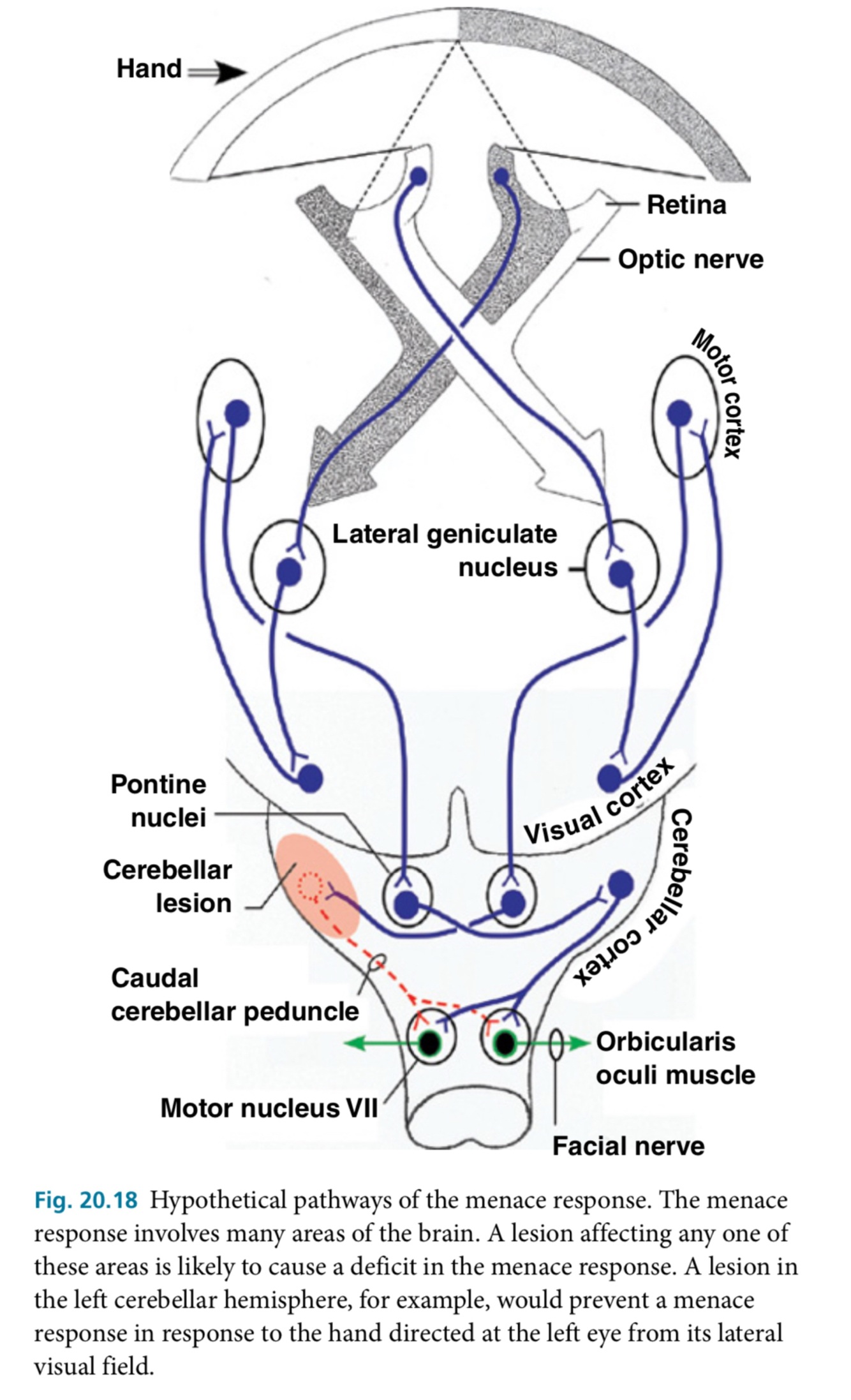 Retina (rods,cones) > bipolar neurons > ganglion neurons > optic nerve > optic chiasm > optic tract > lateral geniculate nucleus > optic radiation > visual cortex > internal capsule association fibers > motor cortex > internal capsule projection fiber > crus cerebri > longitudinal fibers of the pons > pontine nucleus > transverse fibers of the pons and middle cerebellar peduncle > cerebellar cortex > efferent cerebellar pathway > facial nuclei > facial muscles, orbicularis oculi