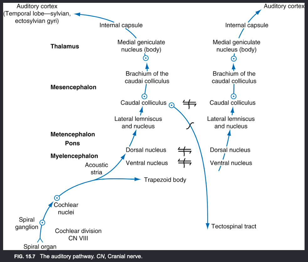1) pathway for conscious perception of sound > from cochlear nuclei > acoustic stria to ventral and dorsal nuclei of the trapezoid body> lateral lemniscus and nucleus > caudal colliculus (synapse) > medial geniculate nucleus (synapse) > internal capsule, centrum semiovale, corona radiata > mainly contralateral auditory cortex of the temporal lobe (sylvian and ectosylvian gyrus)