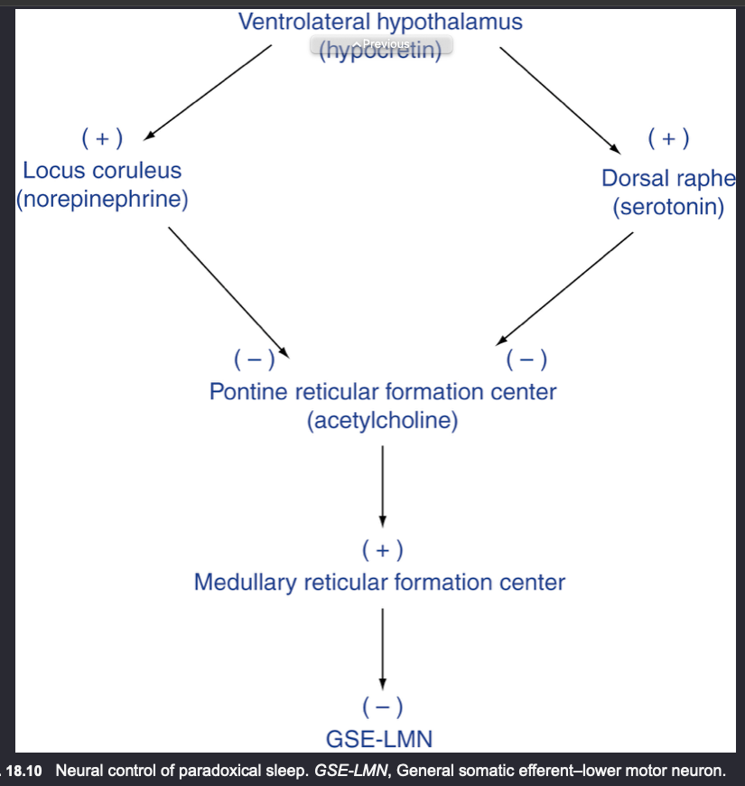 When these neurons are inactive, the pontomedullary centers are released from inhibition > they release AcH and activate the medullary reticular formation which releases an unknown neurotransmitter and inhibits the GSE-LMN causing atonia of paradoxical (REM) sleep