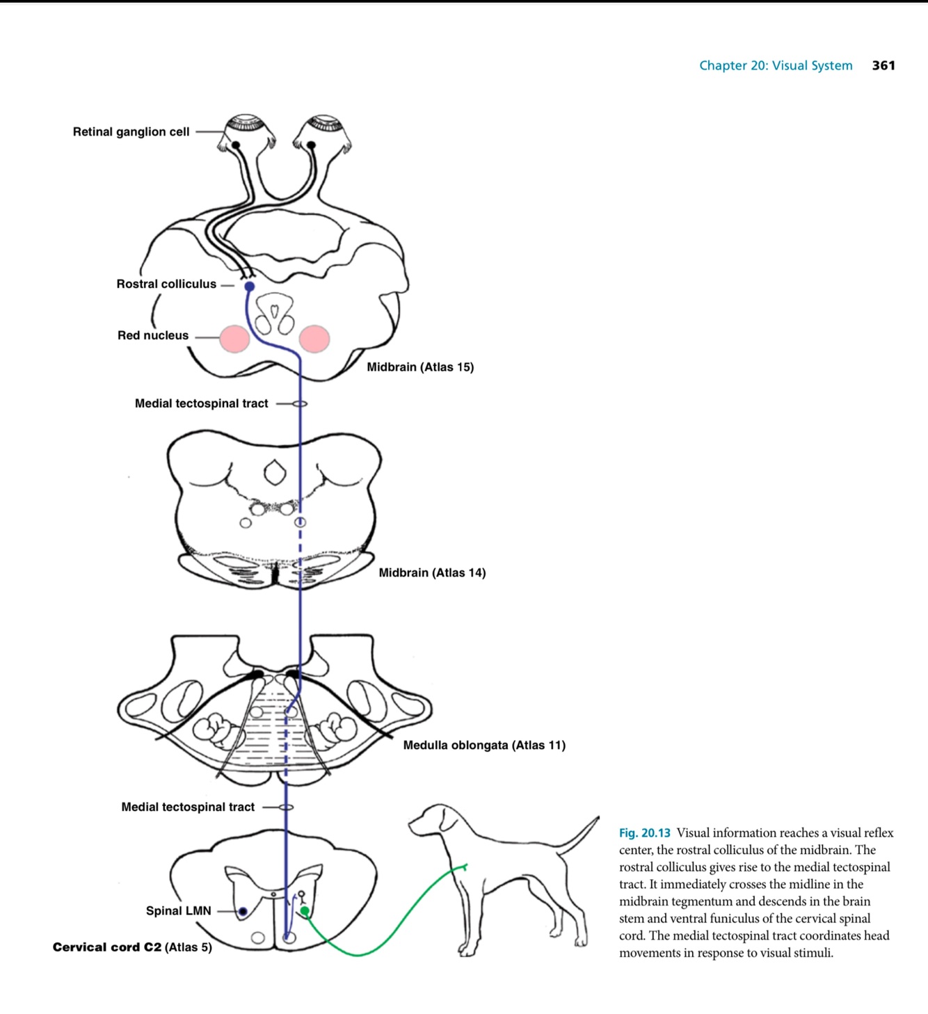 rostral colliculus. The medial tectospinal tract crosses to the contralateral side in the midbrain before descending to the ventral funiculus of the cervical segments of the spinal cord. Some fibers of the medial tectospinal tract innervate the cervical spinal motor nuclei to trigger reflex responses of the head and body to flashes of light or motion of an object.