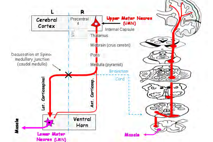 The corticospinal pathway is described as a “two-neuron chain” (upper and lower motor neuron). The upper motor neuron (UMN) s a pyramidal cell in the cerebral cortex (pre central gyrus). The myelinated axons of these upper motor neurons descend via the ipsilateral internal capsule, down through the middle third of the crus cerebri in the midbrain. From the midbrain they reach the pons and the fibers coalesce on the ventral surface to continue downward to the pyramids of the ventral medulla. More caudally in the medulla, at the spinomedullary junction, most of the corticospinal fibers (~85%) decussate (a.k.a. pyramidal decussation) to become the lateral corticospinal tract which is located in the lateral aspect of the spinal cord. At this point, the axons are still part of the same neurons at the pathway’s origin in the precentral gyrus.