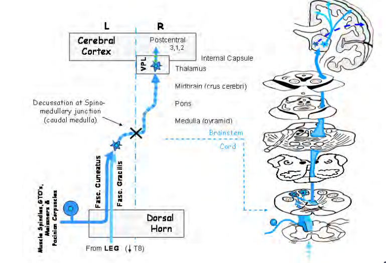 The Pathway: Centrally directed processes of the primary (1°) neurons in the dorsal root ganglia send large myelinated fibers into the spinal cord. Ascending branches of these fibers enter the dorsal columns, specifically the fasciculus gracilis (fibers from the leg) and a more laterally located fasciculus cuneatus (which appears as fibers from the upper limb enter the cord more rostrally). These primary fibers ascend to the spinomedullary junction where they synapse ipsilaterally with second order (2°) neurons located in the nucleus gracilis and nucleus cuneatus respectively.
