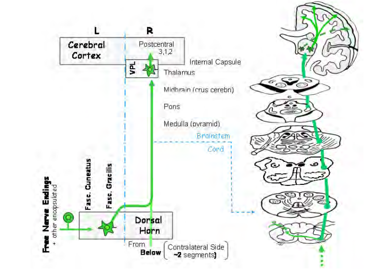 The lateral spinothalamic pathway is for perception and localization of pain (and temperature) by virtue of its somatotopic representation in the postcentral gyrus. This pathway is coined the “fast-pain” pathway to distinguish these pain sensations from the more noxious affect of painful stimuli which is regarded as “slow pain”. In a neurological exam, testing cutaneous sensation with a cold object or a pointed object (i.e. a broken applicator stick or tongue depressor) is very useful for assessing sensory loss due to either peripheral nerve lesion or lesions to the central pathway described here. The sensitivity and spatial resolution for “fast” pain/temperature make this an excellent modality for dermatome mapping.