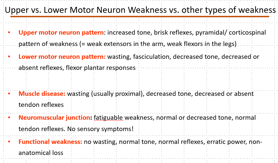 Go over signs caused by muscle disease, NMJ disease or functional weakness