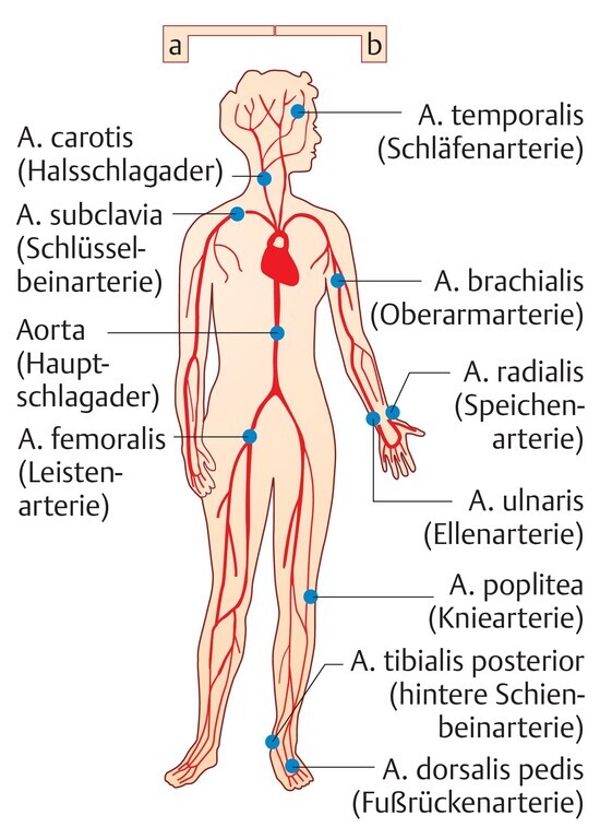 A. femoralis, A. poplitea, A. brachialis, A. radialis, A. carotis communis, A. temporalis