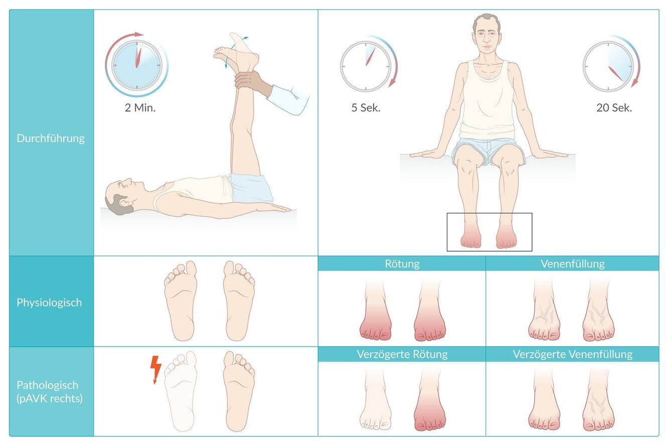 Durchführung: Der Patient liegt auf dem Rücken, hebt die Beine im 90°-Winkel an, führt Bewegungen im Sprunggelenk durch und hält diese Position über 2 Minuten (oder bis zum Einsetzen von Schmerzen). Anschließend setzt sich der Patient mit herabhängenden Beinen hin und die reaktive Hyperämie und Venenfüllung der Füße wird beurteilt. Normal: Leichte reaktive Hyperämie innerhalb von ca. 5 Sekunden, Venenfüllung innerhalb von ca. 20 Sekunden; bei Vorliegen einer pAVK dauert dies deutlich länger. Je intensiver jedoch der Grad der reaktiven Hyperämie ist, desto stärker ist der Sauerstoffmangel im Gewebe.