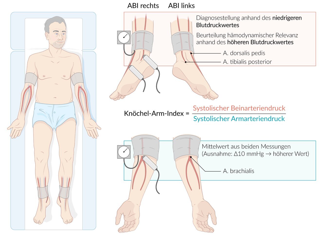 Dafür wird an beiden Oberarmen je eine Messung durchgeführt und anschließend der Mittelwert der beiden Werte verwendet. Ausnahme: Beträgt der Druckunterschied ≥10 mmHg, wird der höhere Wert genutzt. Am Unterschenkel wird der systolische Blutdruck der A. dorsalis pedis und der A. tibialis posterior bestimmt (Knöchelarteriendruck). Laut der aktuellen S3-Leitlinie ist von diesen beiden Werten für den Knöchelarteriendruck der niedrigere Wert maßgeblich zur Diagnosestellung und zum Ausschluss der pAVK, der höhere Wert maßgeblich zur Beurteilung der hämodynamischen Relevanz und Durchblutung. In den meisten älteren Studien wurde für die Diagnosestellung der höhere Druck verwendet