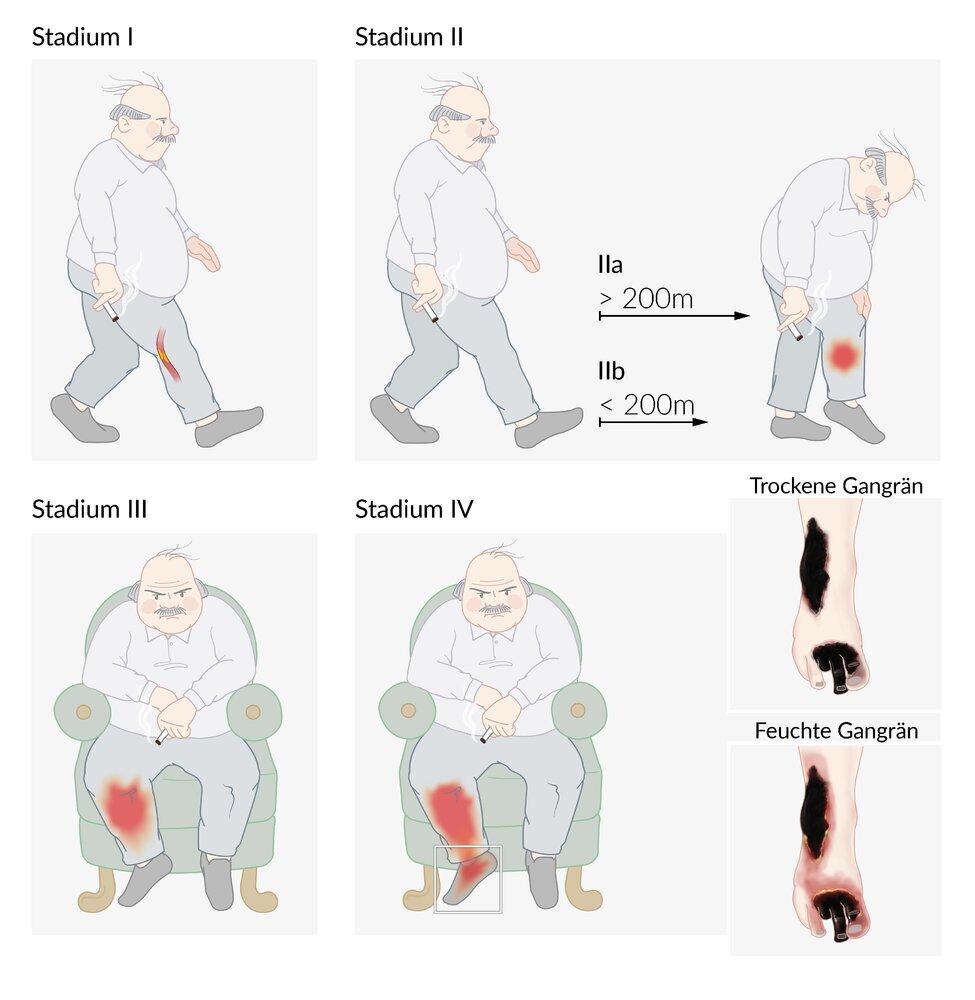 Die gängige Klassifizierung nach Fontaine-Ratschow teilt die pAVK anhand des klinischen Schweregrads der Durchblutungsstörung in vier Stadien ein: