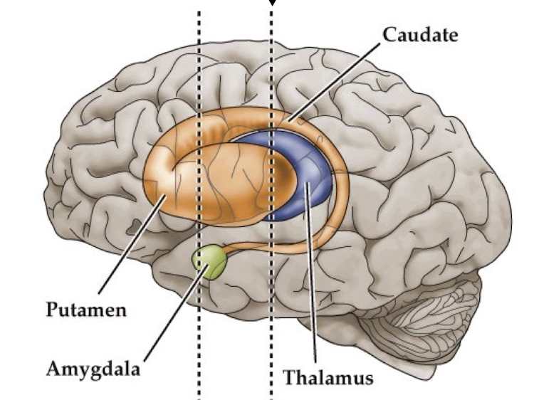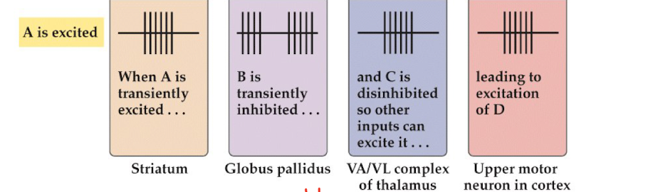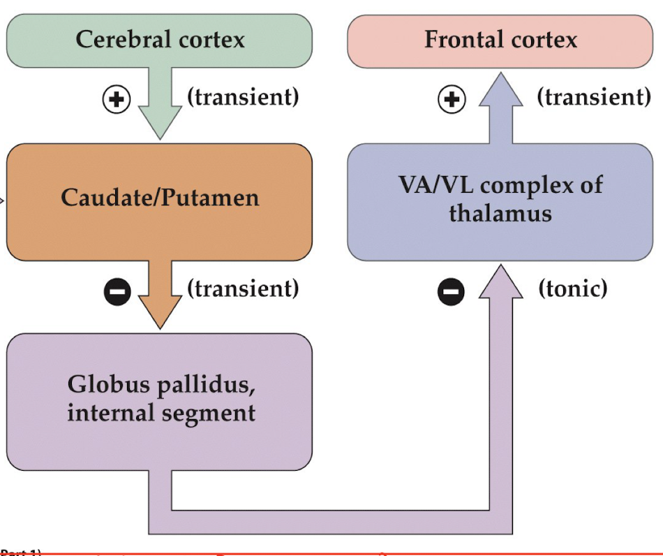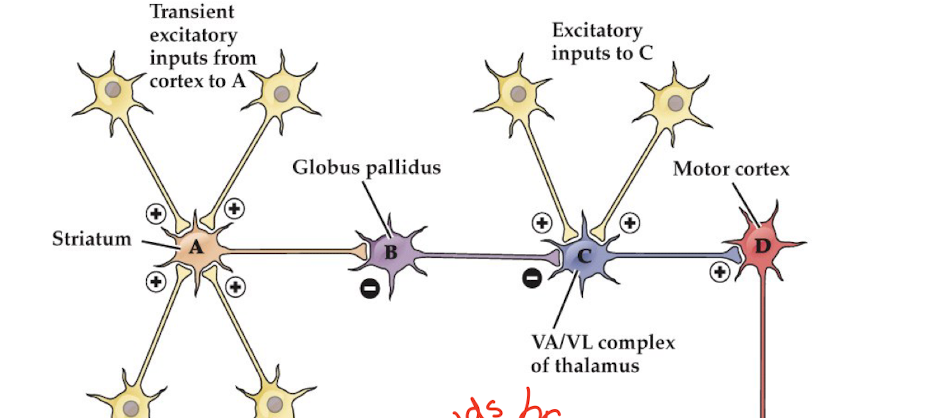 Direct –> striatum (+), MSN (-), GPi (-), Thalamus (+)