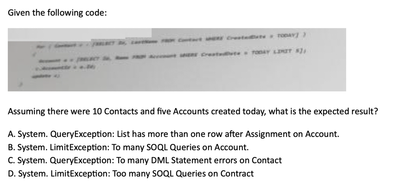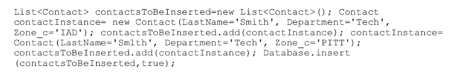 The Contact object has a custom field called ‘Zone.’ Its data type is ‘Text’ and field length is 3. What is the outcome aer execung the following code snippet in the org?