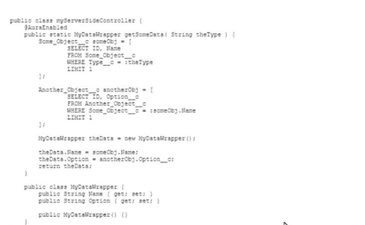 Consider the controller code above that is called from a Lightning component and returns data wrapped in a class.