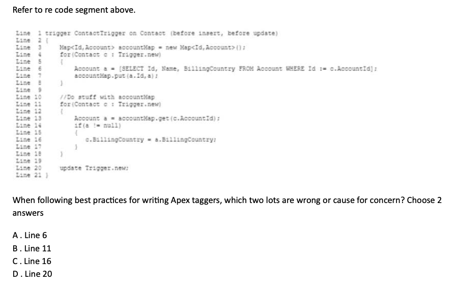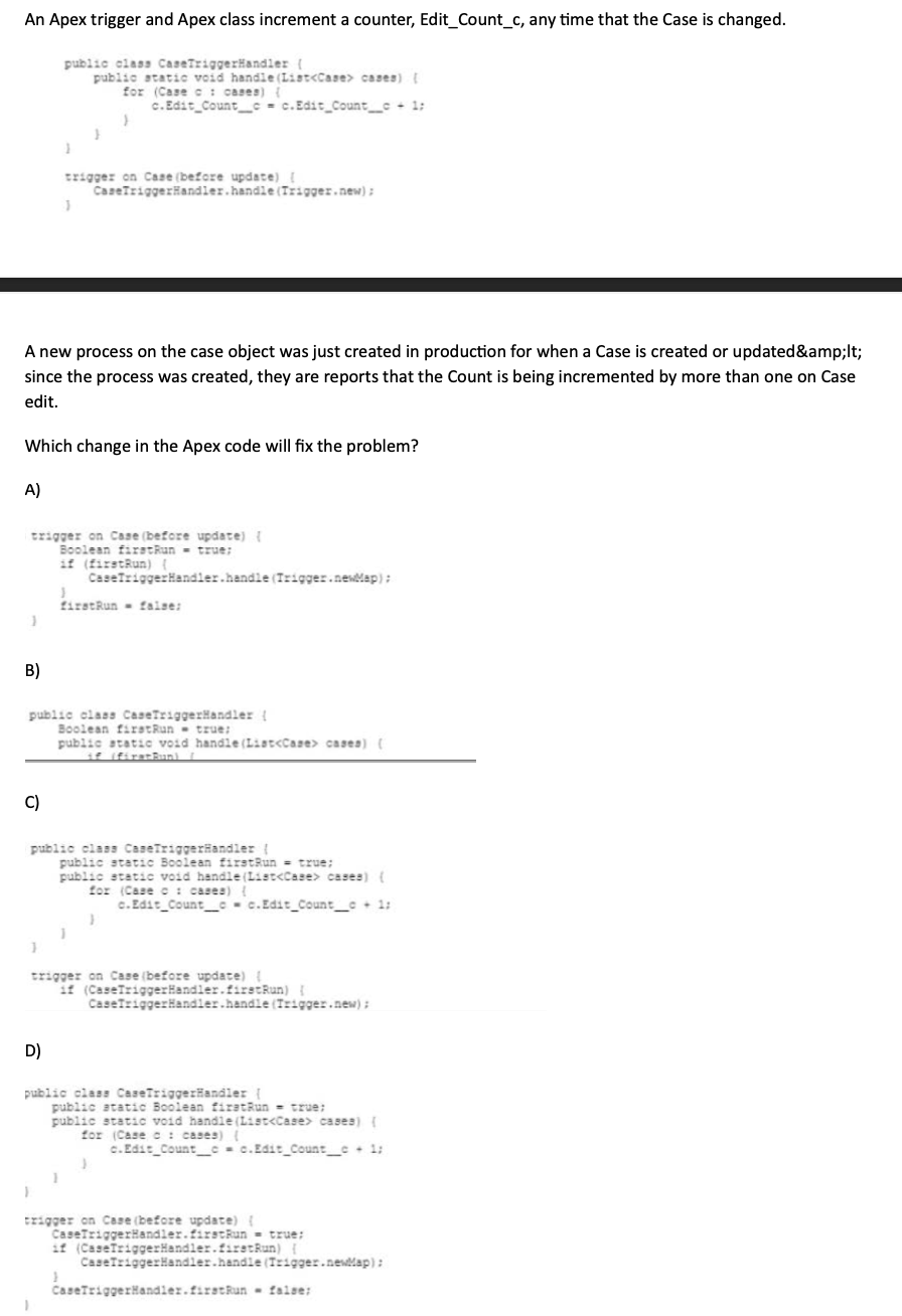 A custom field Exec_Count_c of type Number is created on an Account object. An account record with value of ‘1’ for a: Exec__Count_c is saved. A workflow field update is defined on the Exec_Count_c field, to increment its value every me an account record is created or updated. The following trigger is defined on the account: