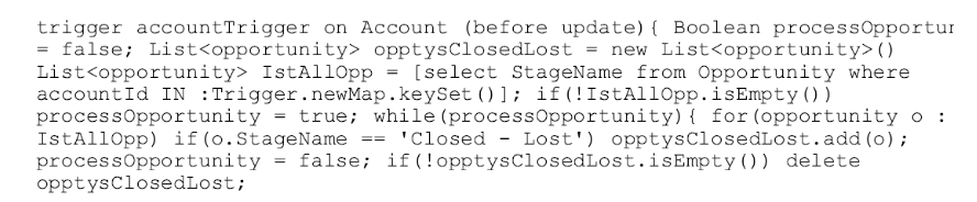A . SOQL could be avoided by creang a formula field for StageName in Account from the related Opportunity B . The code will result in a System.LimitExcepon : Too many script statements error