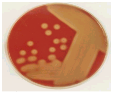 Blood-agar plate + beta- haemolysis