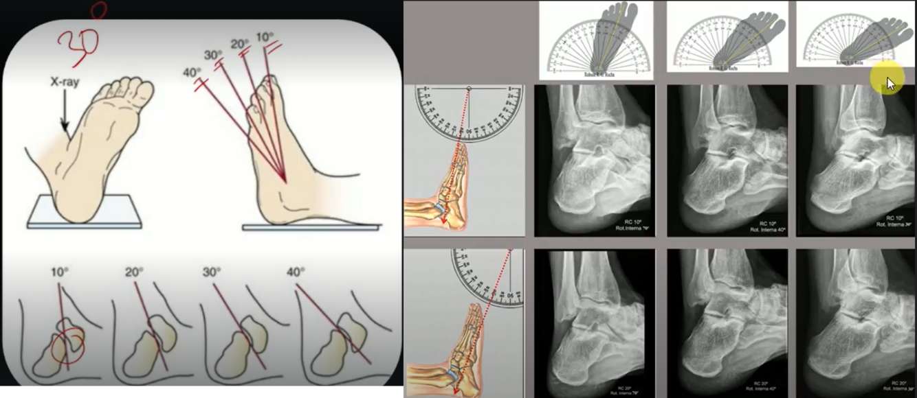 Incidência AP com rotação interna de 30º e inclinação cranial da ampola da radiografia em 10º, 20º, 30º e 40º para avaliação da faceta posterior.