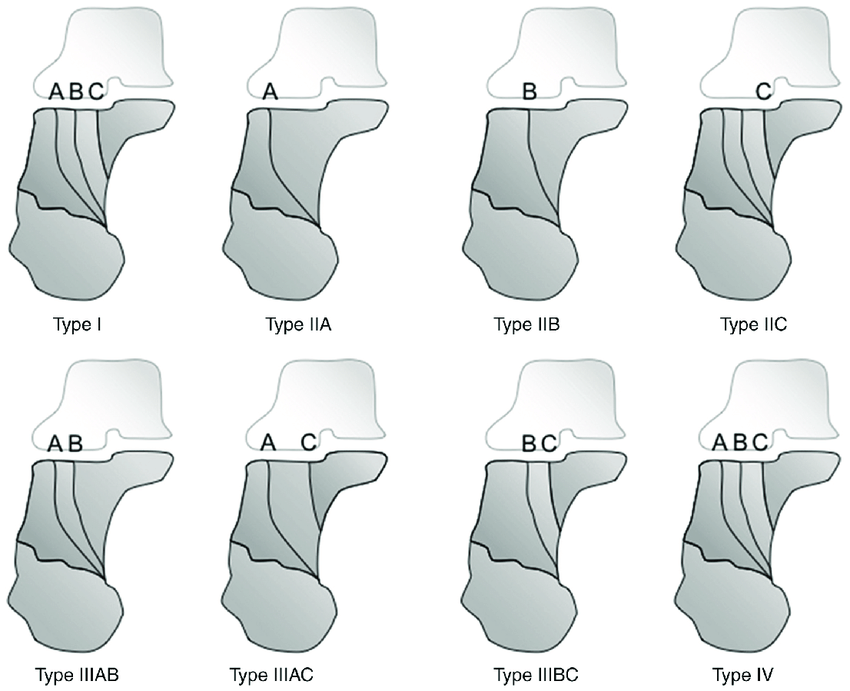 Consiste em uma classificação tomográfica no corte coronal ao nível do sustentáculo do tálus, onde a classificação numérica é referente a quantidades de fragmentos desviados e subclassificada em A, B e C de acordo com a posição das linhas de lateral para medial, sendo a linha C próxima ao sustentáculo do tálus.