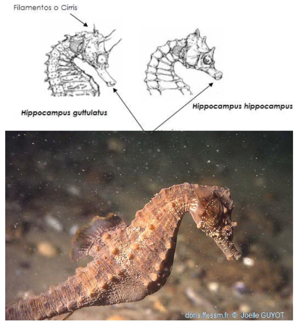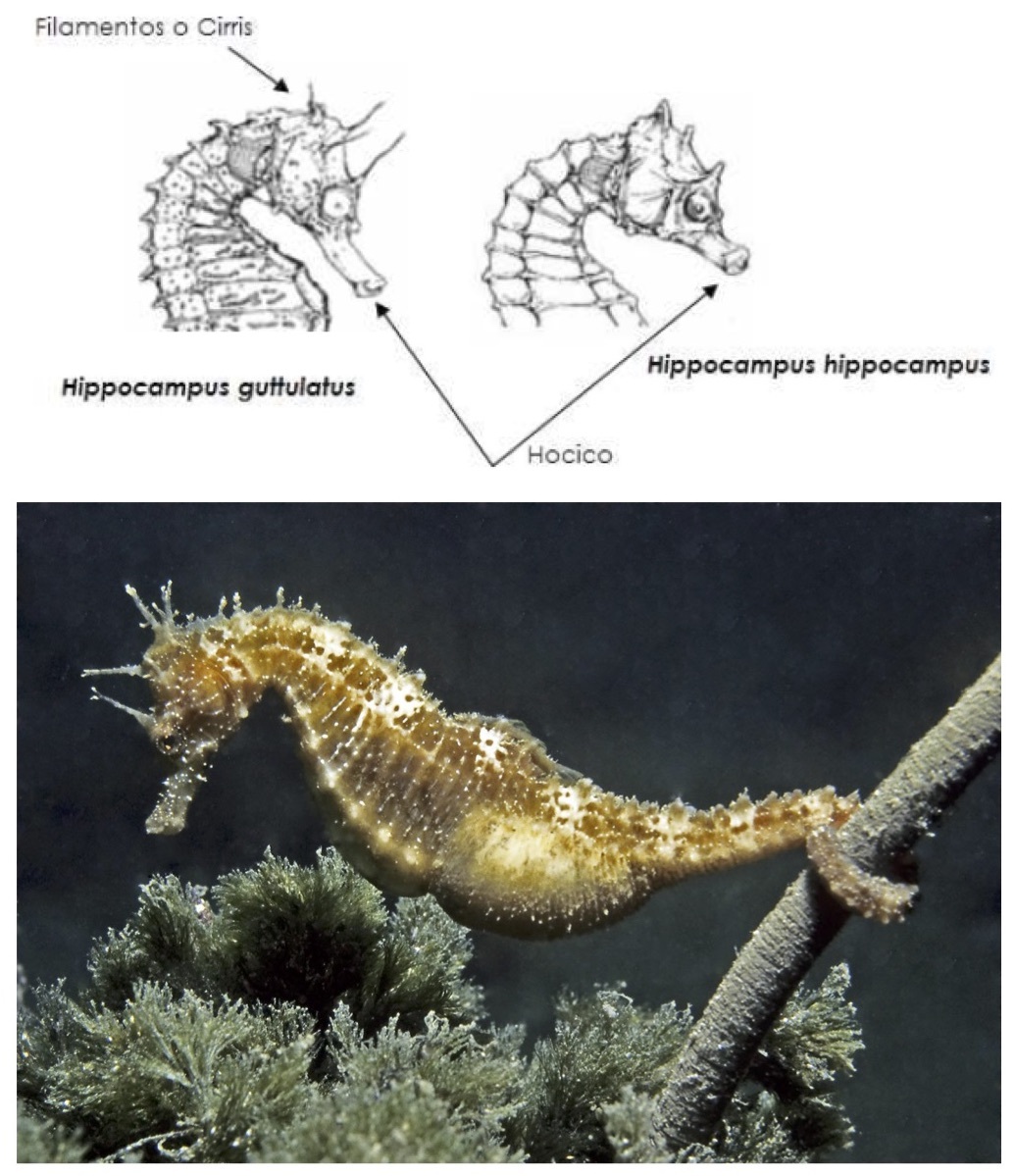 suele presentar unos filamentos o cirris en la cabeza, de los que carece H. hippocampus.