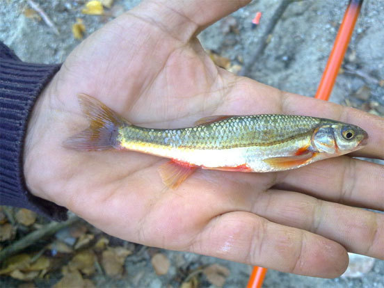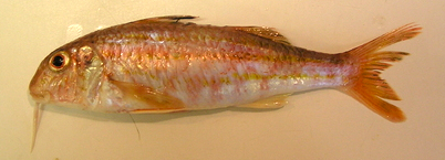 Color rojizo. En los flancos, una banda longitudinal rojiza que cruza los ojos y debajo tres bandas amarillas.