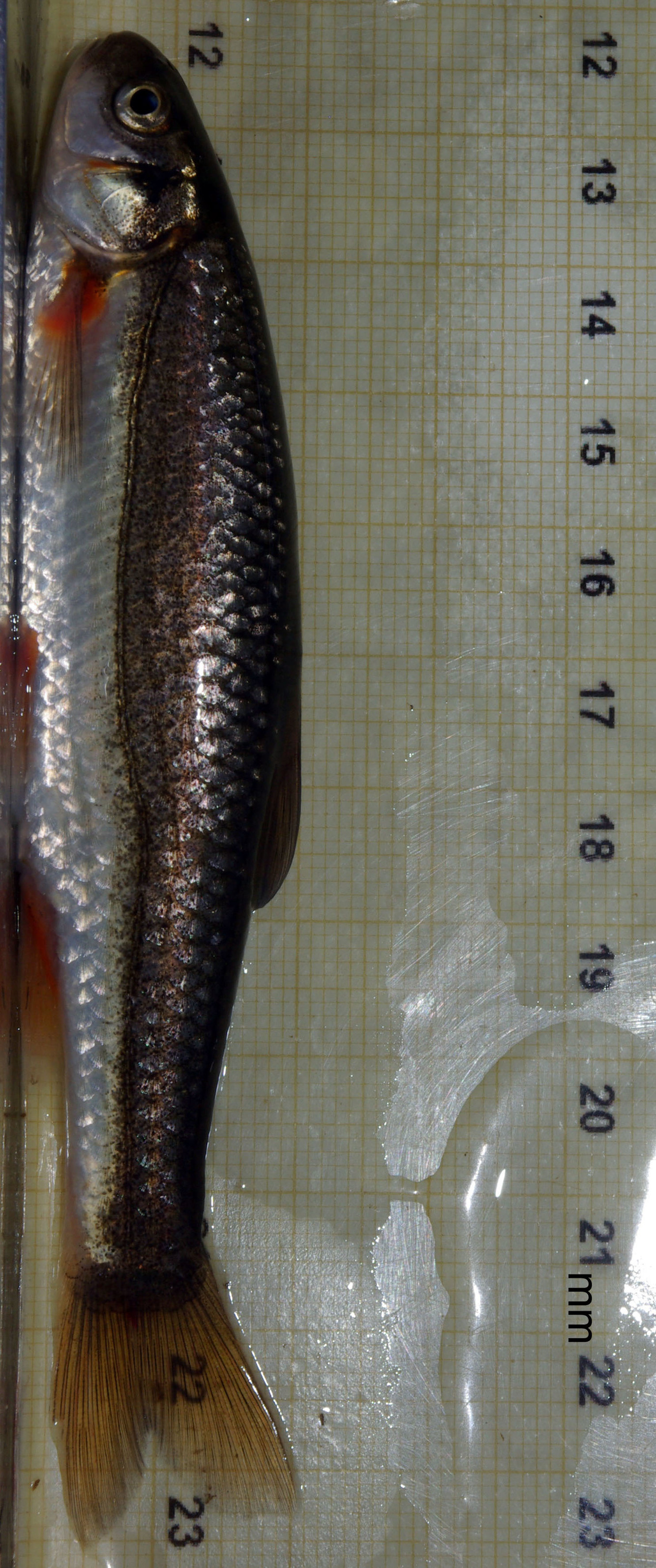 Color gris verdoso metálico por el dorso con reflejos dorados; blanco plateado por los flancos y el vientre.