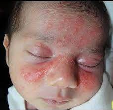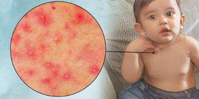 Eritema tóxico: máculas eritematosas com pústulas ou vesículas centrais espalhadas sobre todo corpo