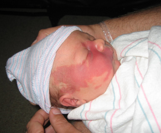 1 week old baby with really large red spot on R side of face