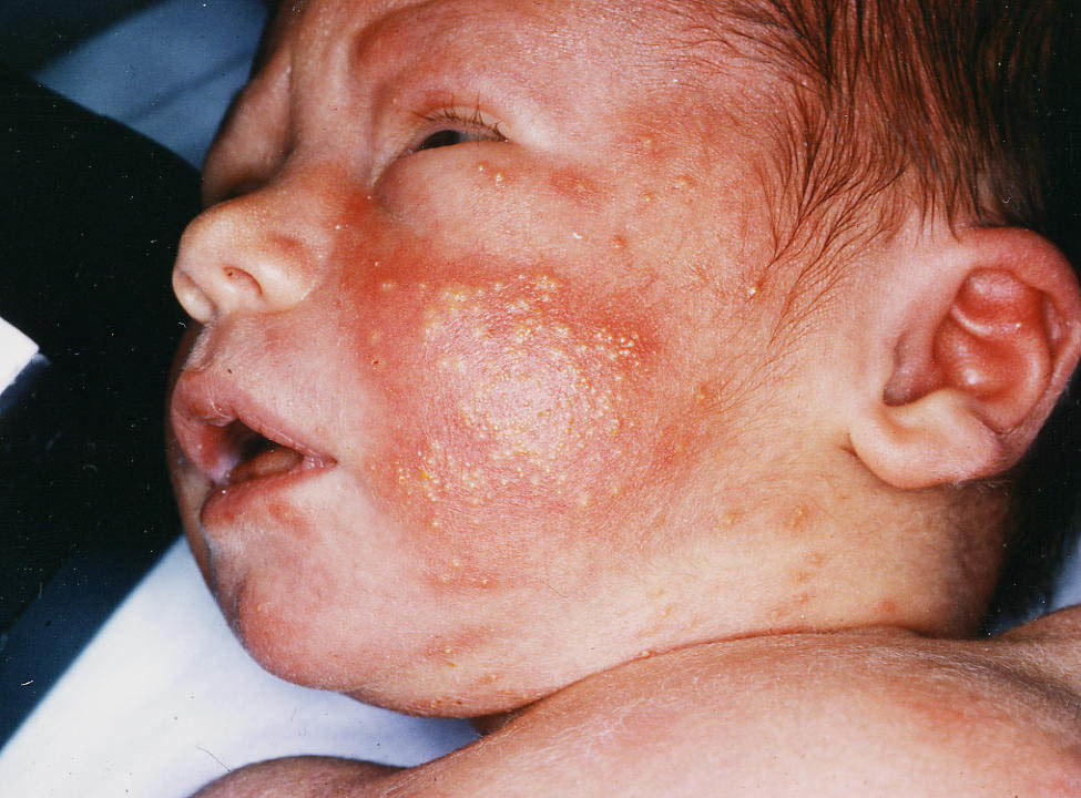 Erythematous, try, crusting lesions on the face, scalp, perineum, postauricular and intertrigenous Areas